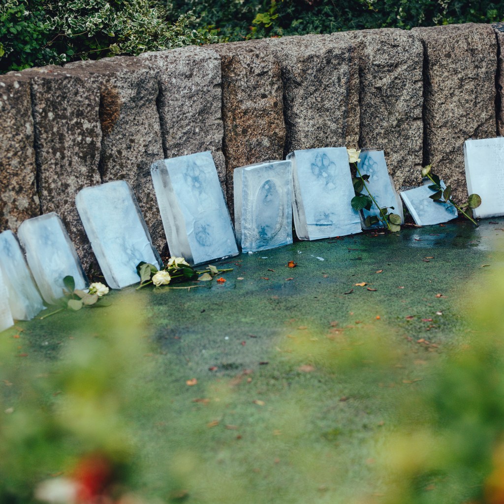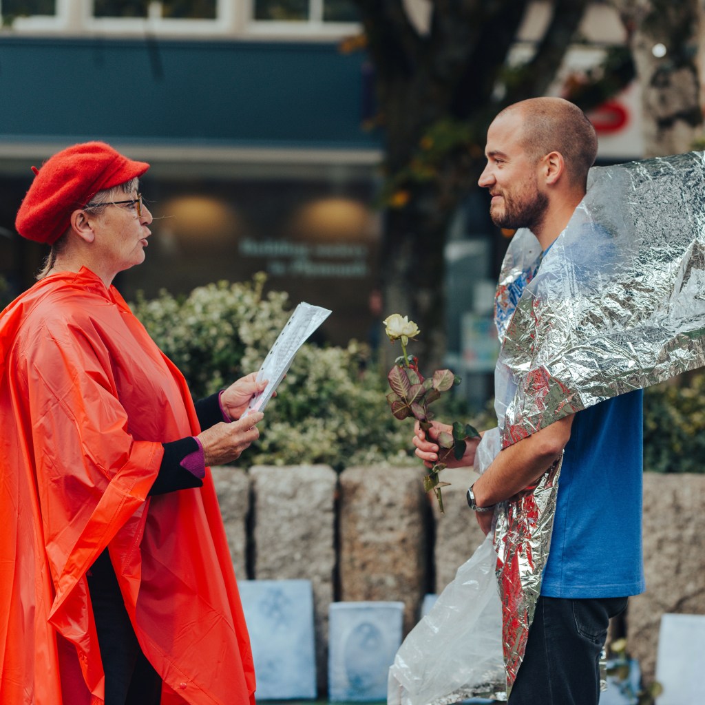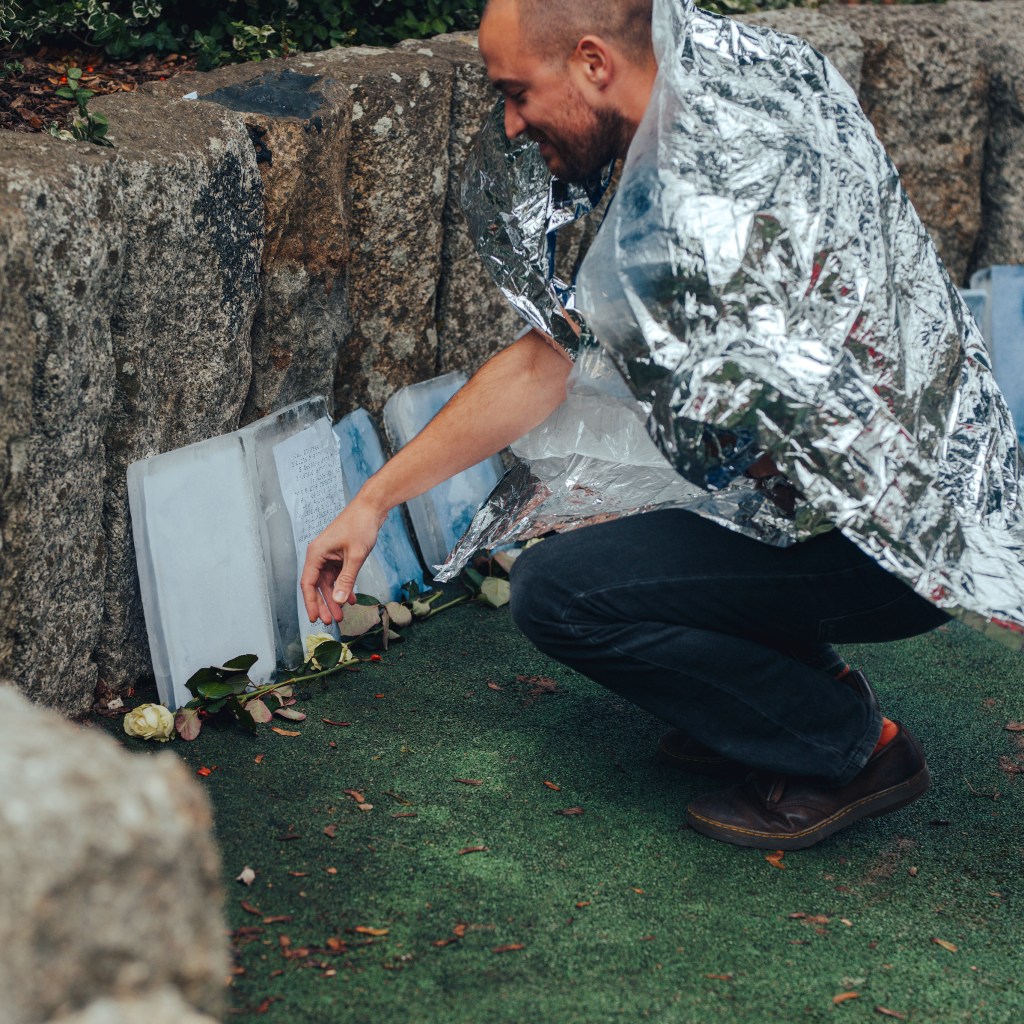 Go Rewild Yourself was a small scale and simple art project that involved about 25 participants, and took place during Plymouth Art Weekender 2019. Each of the participants created a simple block of ice that represented a tombstone for a lost species, and brought it along to Armada Way to ceremonially place it with the others as a way of acknowledging the sixth mass extinction (the climate and ecological emergency). Over the course of the day the tombstones melted away to nothing, echoing the demise of the species that are lost.